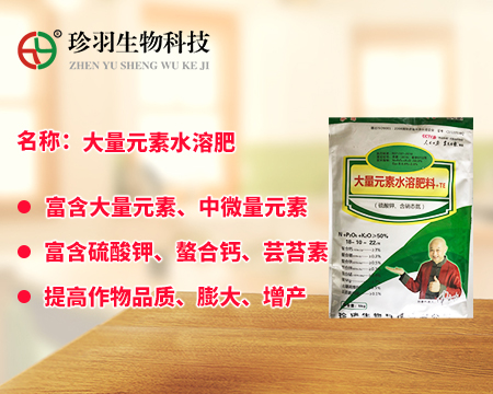 大量元素水溶肥料為經(jīng)水溶解或稀釋,用于灌溉施肥、葉面施肥、無土栽培、浸種蘸根等用途的液體或固體產(chǎn)品,可以葉面施肥、浸種蘸根、灌溉施肥,灌溉包括噴灌、滴灌等方式進行灌溉時施肥,既節(jié)約用水,又節(jié)約施肥,而且還植物吸收快,大量元素水溶肥是一種可以完全溶于水的多元復合肥料,它能迅速地溶解于水中,更容易被作物吸收,而且其吸收利用率相對較高,我們看一下珍羽生物的大量水溶肥。